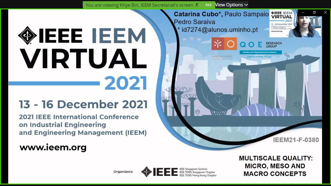 The Research Group on Quality and Organizational Excellence (RG-QOE) was represented by Catarina Cubo and Mónica Cabecinhas at the IEEE International Conference on Industrial Engineering ane Engineering Management (IEEM) 2021 that took place virtually between December 13 and 16. Catarina Cubo and Mónica Cabecinhas participated in the “Quality Control and Management 2” session on last December 15.